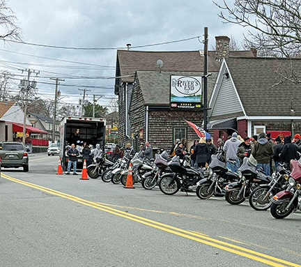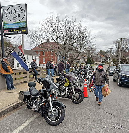 Motorcycles are lined up in front of River’s End Cafe on a brisk and cold Sunday morning, 11/30/25 when about 30 motorcyclists showed up to volunteer for the annual Acushne Lions food and toy drive and bike run, with donations going to the Shepherd’s Food Pantry in Acushnet. Submitted photo.