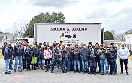 Volunteers pose in front of the truck after unloading donations on a brisk and cold Sunday morning, 11/30/25, when about 30 motorcyclists showed up to volunteer for the Acushnet Lions annual food and toy drive and bike run, with donations going to the Shepherd’s Food Pantry in Acushnet. Submitted photo.
