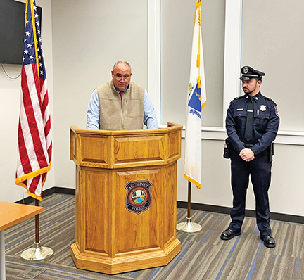 - Acushnet police officer, Justin Melo (RIGHT listens as Chief Gary Coppa speaks during a ceremony swearing in Officer Melo on 3/12/26. Photo from Acushnet Police Department Facebook page.
