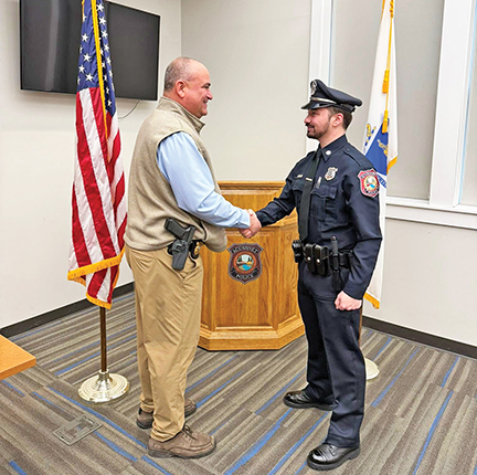 - L-R: Acushnet Police Chief, Gary Coppa, shakes the hand of police officer, Justin Melo on 3/12/26, after he is sworn in. Photo from Acushnet Police Department Facebook page.