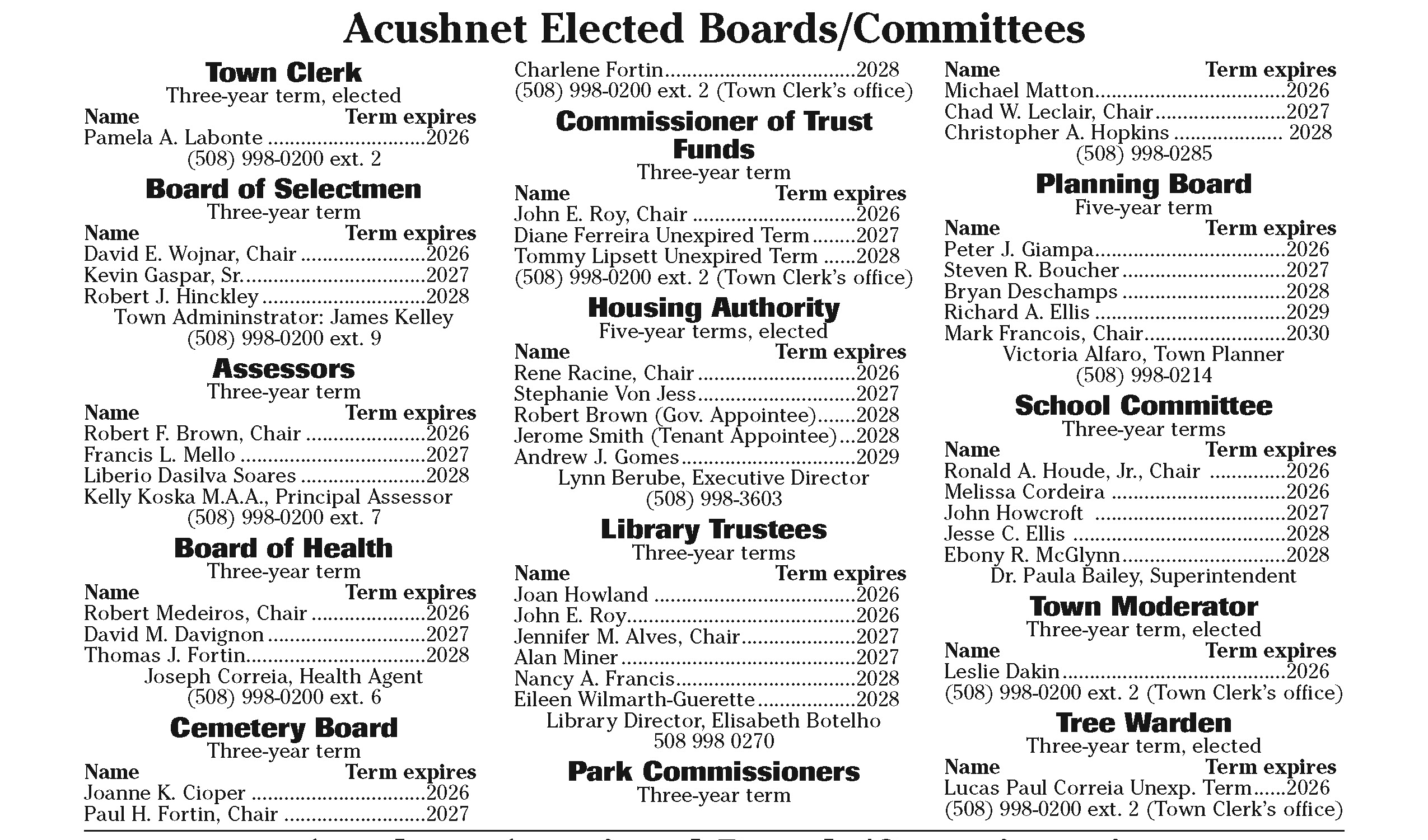 Editor’s Note: The names come from the Town Clerk’s records and the town website. If your name appears in error, or does not appear where it should, please call the Town Clerk’s office at 508-998-0215.