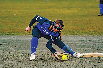 - Fairhaven Blue Devil, Aislyn Flynn, contorts her body to catch the ball during the softball game on 3/30/26 when Fairhaven beat Dartmouth 21-1 at Dartmouth. Photo by Caden Lisa for the Fairhaven Neighborhood News.