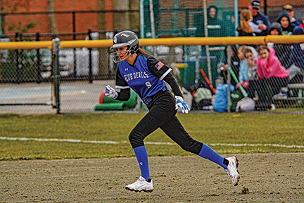 - Fairhaven Blue Devil, Kaia Furtado, runs to second base during the softball game on 3/30/26 when Fairhaven beat Dartmouth 21-1 at Dartmouth. Photo by Caden Lisa for the Fairhaven Neighborhood News.