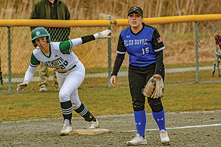 - Fairhaven Blue Devil, Stella Zangao (RIGHT), looks on at her pitcher, standing by third base during the softball game on 3/30/26 when Fairhaven beat Dartmouth 21-1 at Dartmouth. Photo by Caden Lisa for the Fairhaven Neighborhood News.