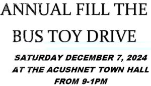 Annual Fill the Bus toy drive by Acushnet Police Department, Sat., 12/6, at Acushnet Town Hall, 122 Main St., from 9 a.m. to 1 p.m. in cooperation with Tremblay Bus Company and Safe Zones. We were able to fill the bus last year and hope for an even larger outpouring of support this year!!!! Accepting… [Read More]