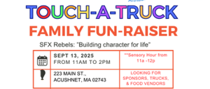 Touch-a-Truck Family fun-raiser on Sat., 9/13, from 11 a.m. to 2 p.m., with sensory hour from 11a.m.-noon, at St. Francis Xavier School, 233 Main St., Acushnet. $5 per person, not to exceed $20 per family. Featuring trucks, food trucks, live music, and a touch-a-truck zone kid zonecwhere kids can jump, play, and slide on open-air… [Read More]