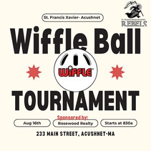 Join us for a wiffle ball tournament to benefit St. Francis Xavier School in Acushnet on Sat., 8/16, at the school, 233 Main Street. Featuring two divisions, kid/adult; cash prizes for winners. We are looking for teams, community partnerships, and sponsors. $25 per child; $30 per adult. Get a t-shirt and pizza. For more information… [Read More]