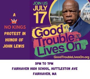 “Good Trouble” rally on the anniversary of the death of John Lewis. At Fairhaven High School, corner of Main and Rte. 6, 5–7 p.m. Join us on the new footbridge on Rte. 18 from 4–5:30 p.m. Organized by: GoodTroubleLives On.org (National Organizer); Indivisible South Coast New England, 50501 Mass., Fairhaven Democratic Town Committee, Mujeres Victoriosas… [Read More]