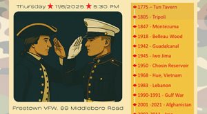 Celebrate 250 years of Marine Corps history, Thurs., 11/6, 5:30 p.m., Freetown VFW, 89 Middleboro Road., Freetown. Casual dress. Buffet dinner, cash bar, cake-cutting ceremony. The event is open to Marines and FMC Personnel only. Please do not bring any family or friends. Hosted by New Bedford Marine Corps League Detachment #1399. Must… [Read More]