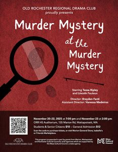 The Old Rochester Regional High School Drama Club will present “Murder Mystery at the Murder Mystery,” a comic murder mystery with a storyline that features a play-within-a-play. The comedic play will be performed at the Old Rochester Regional High School Auditorium, 135 Marion Road, Mattapoisett, at 7 p.m. on Nov. 20-22, as well as 2… [Read More]