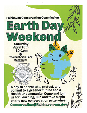 Fairhaven Conservation Commis­sion invites the public to Cushman Park Bandstand on Sat., 4/18, from 10 a.m. to 1 p.m. to celebrate Earth Day.