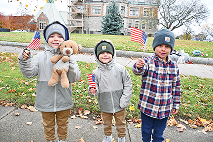 L-R: Siblings Hudson and Parker Horsely wave flags with their cousin, Daniel Fernandes, while waiting for the Fairhaven Veterans Day parade to go by on Main Street on 11/11/25. Photo by Beth David.