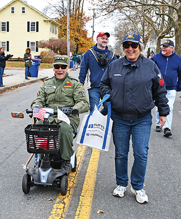 Chuck “Hell on Wheels” Cromwell rolls along Main Street next to his daughter, Cheryl, in the Fairhaven Veterans Day parade on 11/11/25. Photo by Beth David.