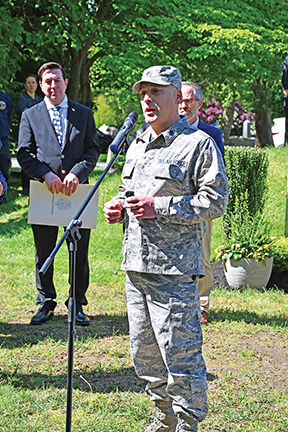 - US Army Veteran Col. Mitch Watkins speaks during the Memorial Day ceremony held at Riverside Cemetery after the Parade in Fairhaven on 5/26/25. Photo by Beth David.