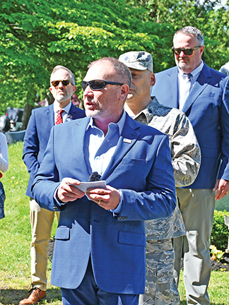 - US Air Force Veteran Jonathan Casey speaks during the Memorial Day ceremony held at Riverside Cemetery after the Parade in Fairhaven on 5/26/25. Photo by Beth David.