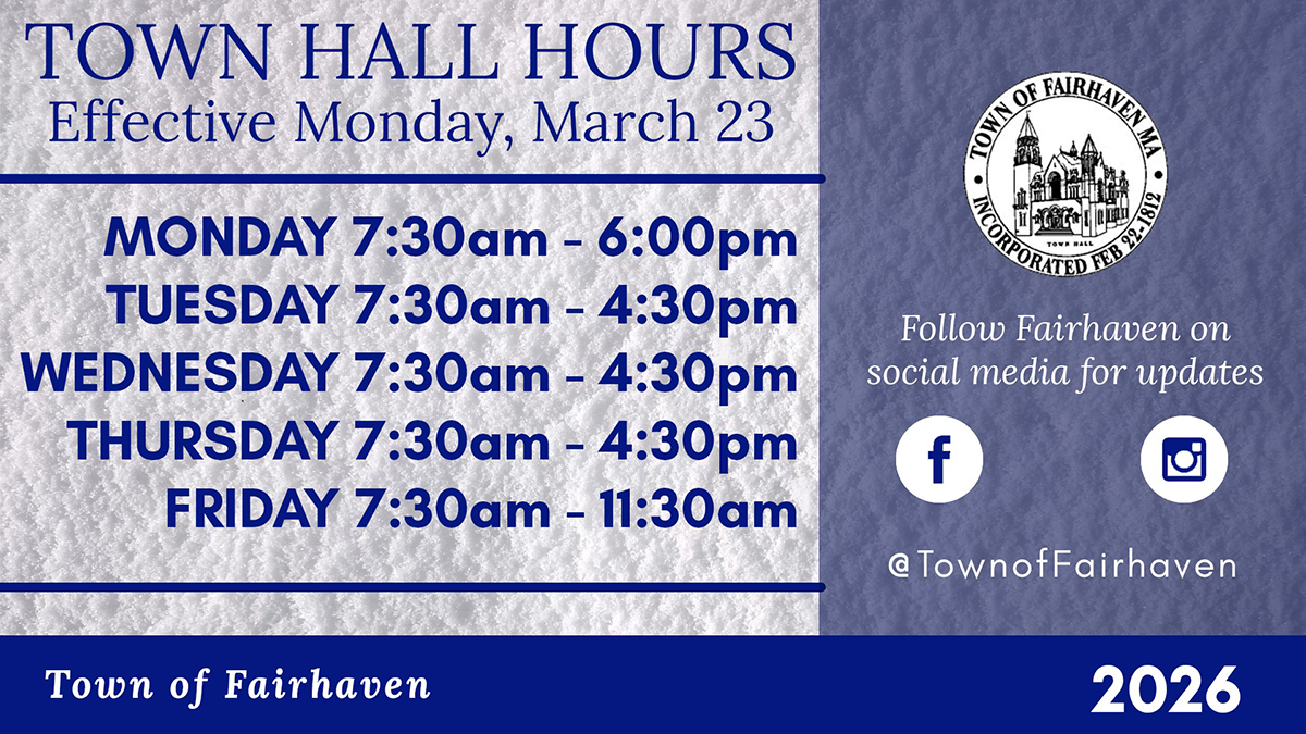 Effective the week of 3/23/26, Fairhaven Town Hall will no longer be open on Friday afternoons. At its meeting on 3/9/26, the Select Board approved a recommendation by Town Administrator, Keith Hickey, and approved by the unions to amend town hall hours.