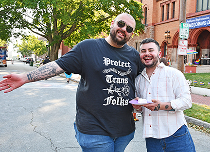 - L-R: Fairhaven Select Board member, Andrew Romano, and his husband Myles, pose for a picture with the local free sheet during Fairhaven’s Got Pride: A Celebration of Love, Family, and Inclusion, on 6/22/25. Photo by Beth David.