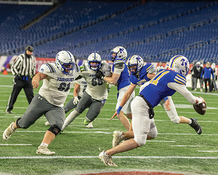 - Fairhaven High School Blue Devil, Zack Moura (#61) chases the quarterback during the championship game at Gillette Stadium on 12/4/25 when the FHS Blue Devils beat Norwell 28-14 to win the Division VI state championship for the second time in three years. Photo by Sam Simoes.