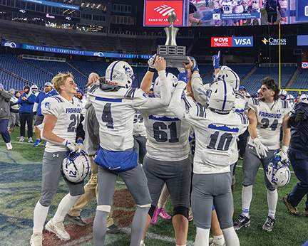 - The Fairhaven High School Blue Devils raise the trophy on the field after the championship game at Gillette Stadium on 12/4/25 when the FHS Blue Devils beat Norwell 28-14 to win the Division VI state championship for the second time in three years. Photo by Sam Simoes.
