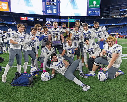 - Seniors on the Fairhaven High School Blue Devils Football team pose with the trophy after the team beat Norwell 28-14 at Gillette Stadium on 12/4/25 to win the Division VI state championship for the second time in three years. Photo by Sam Simoes.