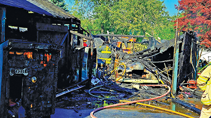 - An old vehicle can be see in the rubble as Firefighters work in the remains of the garage at 10 Rotch Street in Acushnet that was totally destroyed by fire on 8/8/25. Photo from Acushnet Office of Emergency Management Facebook page.