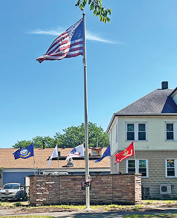 The flags of the five branches of the military fly with the American flag at the US Armed Forces Memorial in Fairhaven on Route 6 between Middle and Main Streets, where the new gardening group, the Green Lanterns, have been working to weed and plant and maintain. Submitted photo