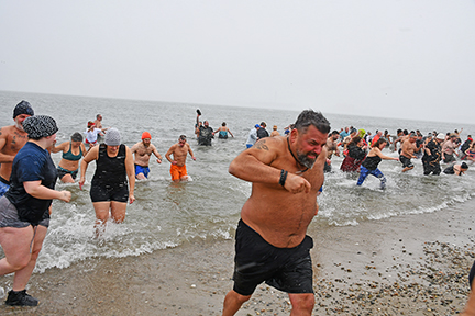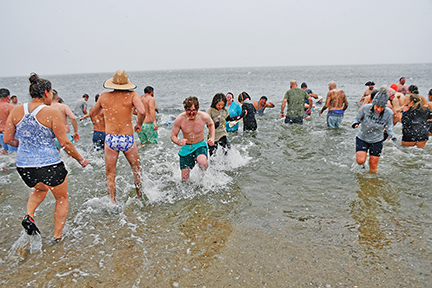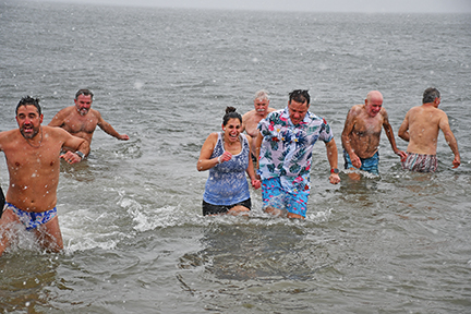 - Plungers get in and out of the water quickly on a cold and windy New Year’s Day 2026 on West Island’s Causeway Road beach for the annual friends and neighbors Polar Plunge. Photo by Beth David.