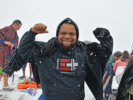 - Ramon raises his fists in victory after diving into the ocean on a windy, snowy New Year’s Day 2026 for the annual Polar Plunge at Fort Phoenix in Fairhaven. Photo by Beth David.