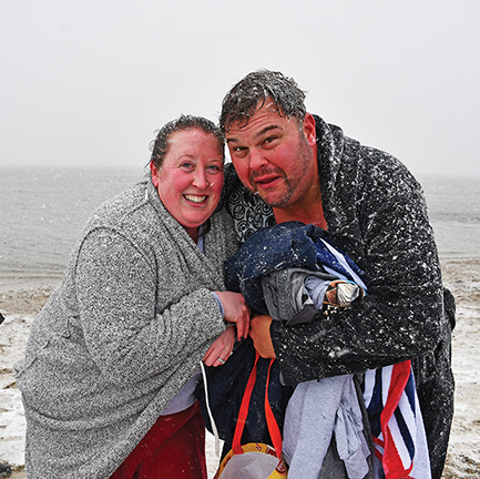 - L-R: Jeannine and Chad Wunschel pose for a quick pic after diving into the ocean on a windy, snowy New Year’s Day 2026 for the annual Polar Plunge at Fort Phoenix in Fairhaven. Photo by Beth David.