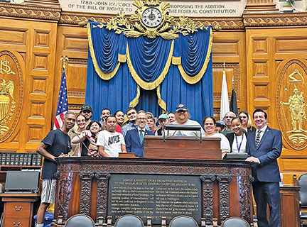 On July 1, 2025, participants of M.O. L.I.F.E’s Fairhaven and Middleborough CBDS (Community-Based Day Support) program take a photo with Rep. Mark Sylvia (D), Fairhaven, at the rostrum in the Massachusetts statehouse that John F. Kennedy spoke from on 1/9/61. Submitted photo.
