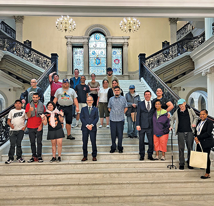 On July 1, 2025, participants of M.O. L.I.F.E’s Fairhaven and Middleborough CBDS (Community-Based Day Support) program take a photo with Rep. Mark Sylvia (D), Fairhaven, inside the Massachusetts statehouse, Submitted photo.