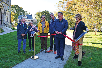 - Sen. Mark Montigny cuts the ribbon on the new StoryWalk on 10/21/25 at the Unitarian Church Lawn in Fairhaven, which was funded by the Montigny Children’s Fund, and built by the Wood Working Group at the Unitarian Universalist Society of Fairhaven. L-R: Fairhaven Selectboard member Natalie Mello; Fairhaven resident Karen Isherwood; Gary Johnson and Don Colassius of the UU Wood Working Group; Sen. Montigny; Allie Thiel, Assistant Director and Head of Youth Services at the Millicent Library. Photo by Beth David.