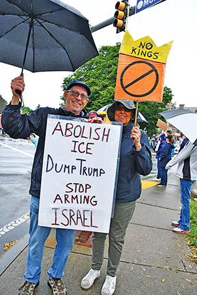 - L-R: Bob and Ann Espindola are among the approximately 1500–2000 protesters lining the sidewalk and lawn in front of Fairhaven High School in the rain on Saturday, 6/14/25, joining nationwide “No Kings” demonstrations to protest President Donald Trump’s disregard for due process for immigrants and his blatant disregard for the rulings of the courts. Photo by Beth David.