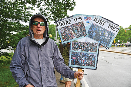 - Herb Foisy holds three signs showing demonstrations at a protest which drew approximately 1500–2000 protesters to line the sidewalk and lawn in front of Fairhaven High School in the rain on Saturday, 6/14/25, joining nationwide “No Kings” demonstrations to protest President Donald Trump’s disregard for due process for immigrants and his blatant disregard for the rulings of the courts. Photo by Beth David.