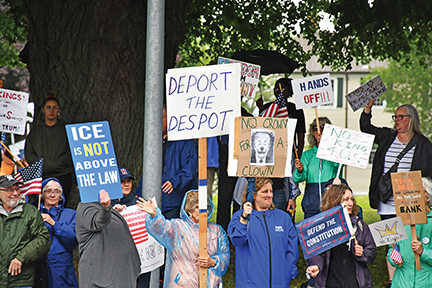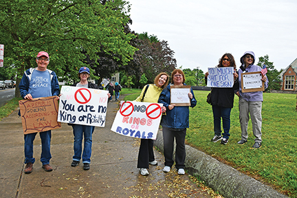 - A group displays their signs for the local free sheet at the end of the protest that drew approximately 1500–2000 protesters to Fairhaven High School in the rain on Saturday, 6/14/25, joining nationwide “No Kings” demonstrations to protest President Donald Trump’s disregard for due process for immigrants and his blatant disregard for the rulings of the courts. Photo by Beth David.
