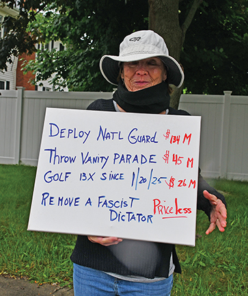 - A woman holds a sign saying removing the dictator is “priceless” at a protest which drew approximately 1500–2000 protesters to line the sidewalk and lawn in front of Fairhaven High School in the rain on Saturday, 6/14/25, joining nationwide “No Kings” demonstrations to protest President Donald Trump’s disregard for due process for immigrants and his blatant disregard for the rulings of the courts. Photo by Beth David.