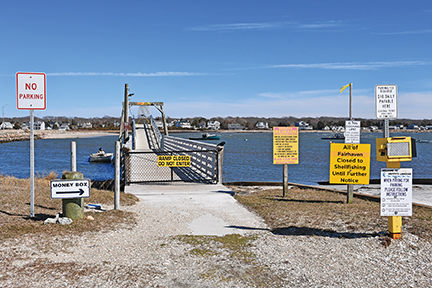 - A small boat is tied to the dock even though the gangway at Hoppy’s Landing is pulled up on 3/17/26, standard procedure when winds are expected to be over 50 MPH, to protect it from damage, while a plethora of signs give information visitors. Photo by Beth David.