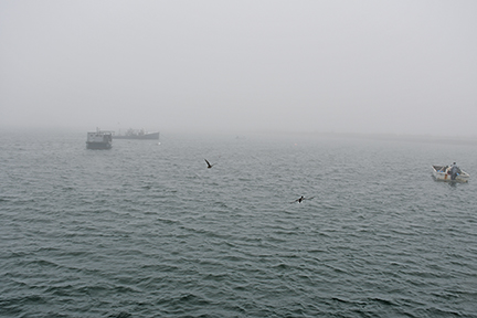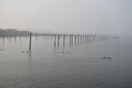 - Geese paddle past fog-shrouded pilings at West Island Marina in Fairhaven on 3/10/26, while the “snow-eating fog” helps to melt the snow on land from the blizzard two weeks before. Photo by Beth David.