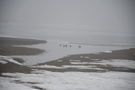 - Geese hang out in an inlet of the foggy marsh on Goulart Memorial Drive in Fairhaven on 3/8/26, while the “snow-eating fog” helps to melt the snow from the blizzard two weeks before. Photo by Beth David.