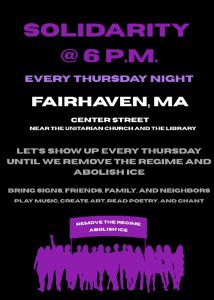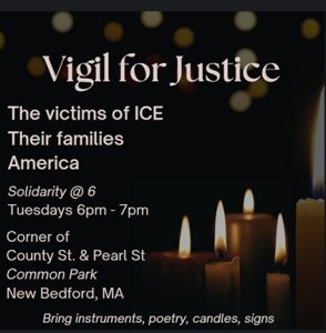 Every Tuesday, 6–7 p.m., corner of County St. & Pearl St., New Bedford. Bring instruments, poetry, candles, signs.