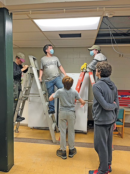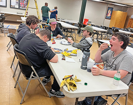 - Scouts from Troop 52 in Fairhaven take a lunch break on 5/31/25 while replacing the ceiling tiles in the basement of St. Mary’s Church for the Eagle Scout project of Patrick Fleming (at head of table). Submitted photo.