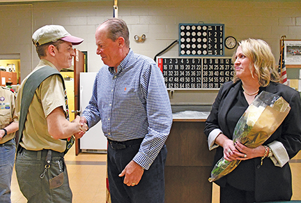 - The newest Eagle Scout of Fairhaven Troop 52, Patrick Fleming, shakes hands with his father, Timothy, while mom, Heather, looks on after Patrick attached the Eagle Scout Dad Pin on his father during the Eagle Court of Honor on 4/9/26 at St. Mary’s Parish Center in Fairhaven. Photo by Beth David.