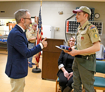- Mass. state Representative Mark Sylvia gives a thumbs up to the newest Eagle Scout of Fairhaven Troop 52, Patrick Fleming, after Patrick receives a state house proclamation and a flag that flew over the state house, during the Eagle Court of Honor on 4/9/26 at St. Mary’s Parish Center in Fairhaven. Photo by Beth David.