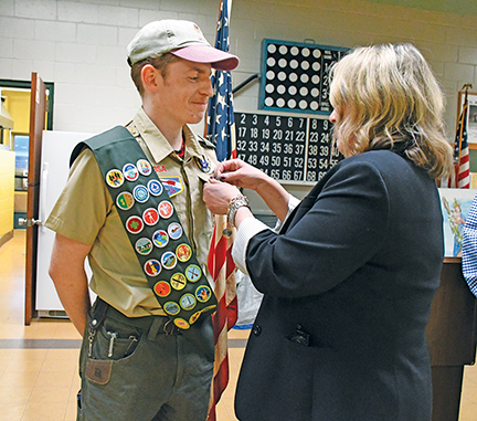 - The newest Eagle Scout of Fairhaven Troop 52, Patrick Fleming, can’t help but smile as his mother, Heather, pins his Eagle Badge on him during his Eagle Court of Honor on 4/9/26 at St. Mary’s Parish Center in Fairhaven. Photo by Beth David.