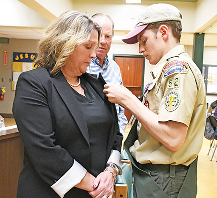 - The newest Eagle Scout of Fairhaven Troop 52, Patrick Fleming, attaches the Eagle Scout Mom Pin on his mother, Heather, while dad, Timothy, looks during the Eagle Court of Honor on 4/9/26 at St. Mary’s Parish Center in Fairhaven. Photo by Beth David.