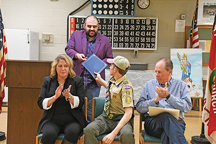 - Fairhaven Select Board Vice Chairperson, Andrew Romano, hands a proclamation to the newest Eagle Scout of Fairhaven Troop 52, Patrick Fleming, during the Eagle Court of Honor on 4/9/26 at St. Mary’s Parish Center in Fairhaven, while mom, Heather, and dad, Timothy applaud. Photo by Beth David.