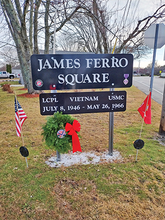 A wreath is placed at the memorial for Vietnam Veteran, LCpl James Ferro in Acushnet oon 12/4/25 as part of Wreaths Across Acushnet, an effort spearheaded by the Veterans Services Office. Photo courtesy of Acushnet Veterans Services Office.